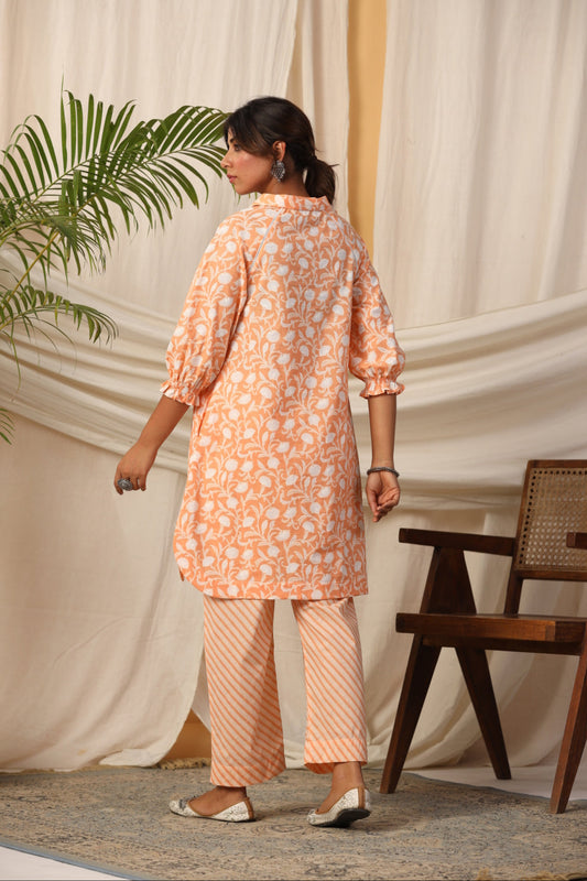 ORANGE SUNSHINE RAGLAN SLEEVE KHADI PRINT KURTA SET