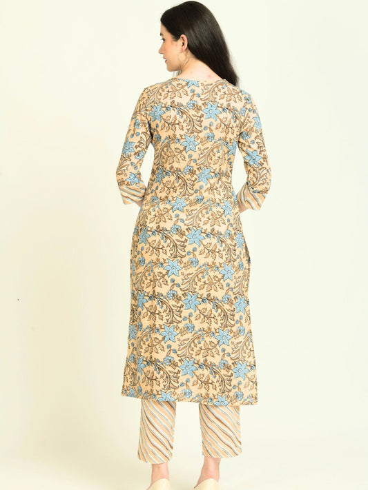 WOMEN’S BEIGE AND ICE BLUE STRAIGHT KURTA WITH PANT SET