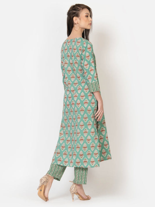 WOMEN’S MUGHAL BUTA PRINT IN GREEN STRAIGHT KURTA WITH PANT SET